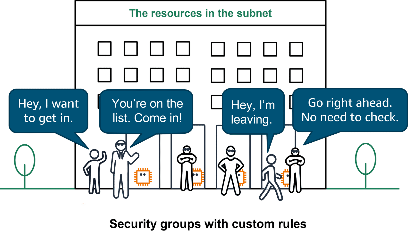 Security groups, as opposed to Network ACL, perform stateful packet filtering, which means that they remember previous decisions made for incoming packets.
